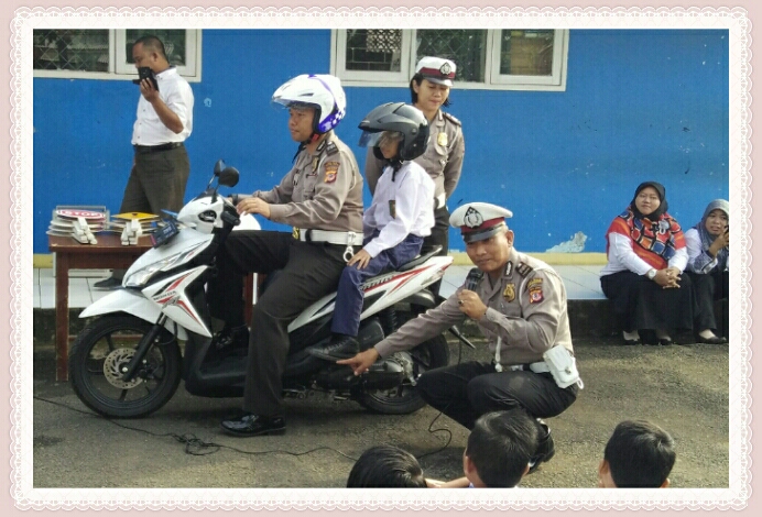 materi yang dibawakan adalah tentang keselamatan berlalu lintas cara aman ke sekolah dengan sub materi diantaranya: 1. Pelanggaran lalu lintas dan korban kecelakaan lalu lintas yg dilakukan oleh anak dibawah umur. 2. Tata cara berjalan kaki dan cara menyeberang jalan supaya aman. 3. Larangan penggunaan sepeda motor 4. Penggunaan helm SNi. 5. Simulasi tips cara aman sebagai penumpang sepeda motor. 6. Rambu rambu lalu lintas dan marka jalan.