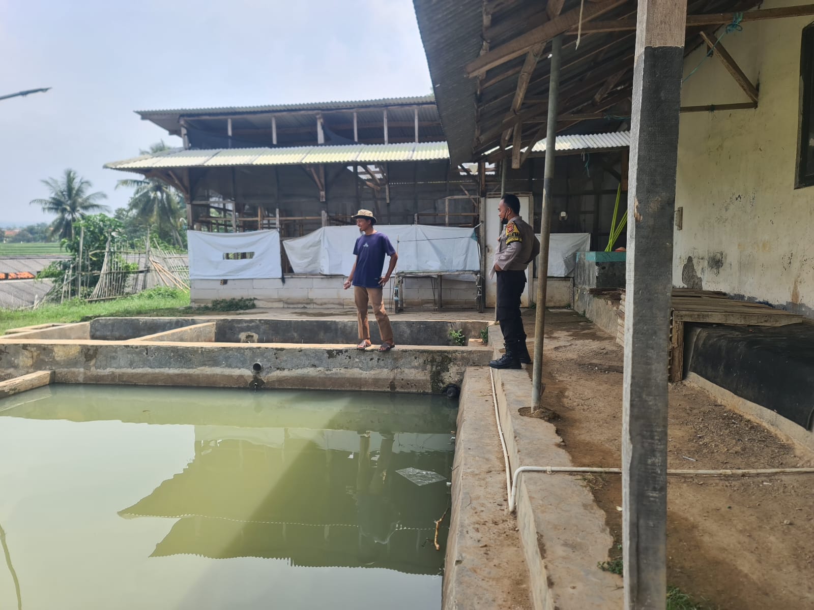 Personel Bhabinkamtibmas Desa Babakansari, Aiptu Herry menyambangi lokasi kolam budi daya ikan milik Dendi yang ada di Kampung Babakan Gudang, Desa Babakansari, Kecamatan Plered, Kabupaten Purwakarta.
