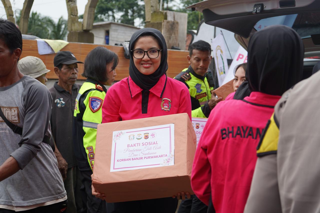 Kegiatan pemberian bantuan sosial bertajuk Bhayangkari Peduli ini diserahkan langsung Ketua Bhayangkari cabang Purwakarta, Ibu Ira Lilik yang didampingi Kapolres Purwakarta AKBP Lilik Ardhiansyah. Bantuan yang diberikan berupa trauma healing hingga bagi-bagi sembako.