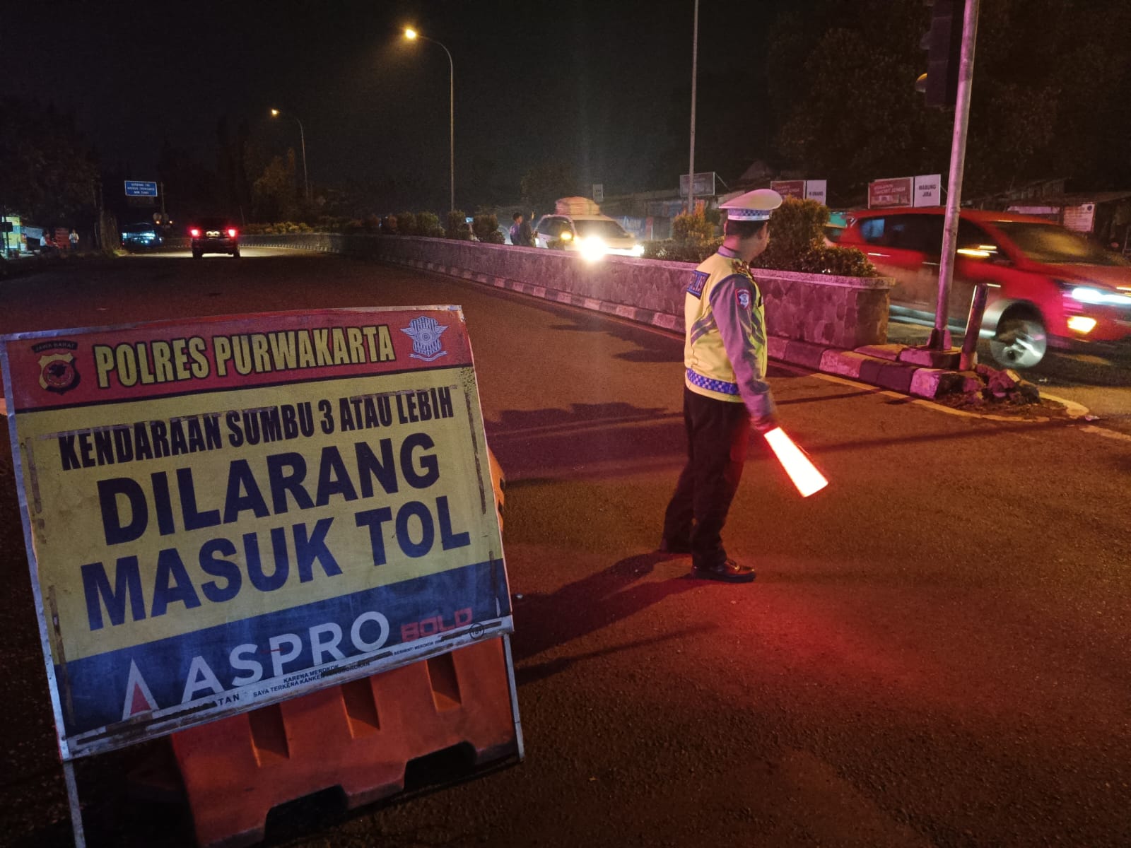 Di Purwakarta, Satlantas Polres Purwakarta menggelar rekayasa lalu lintas berupa pengalihan arus dan pembatasan operasional angkutan barang kendaraan sumbu 3 yang akan memasuki gerbang tol dan masih berada di dalam tol, pada Senin, 24 Maret 2024, dini hari.