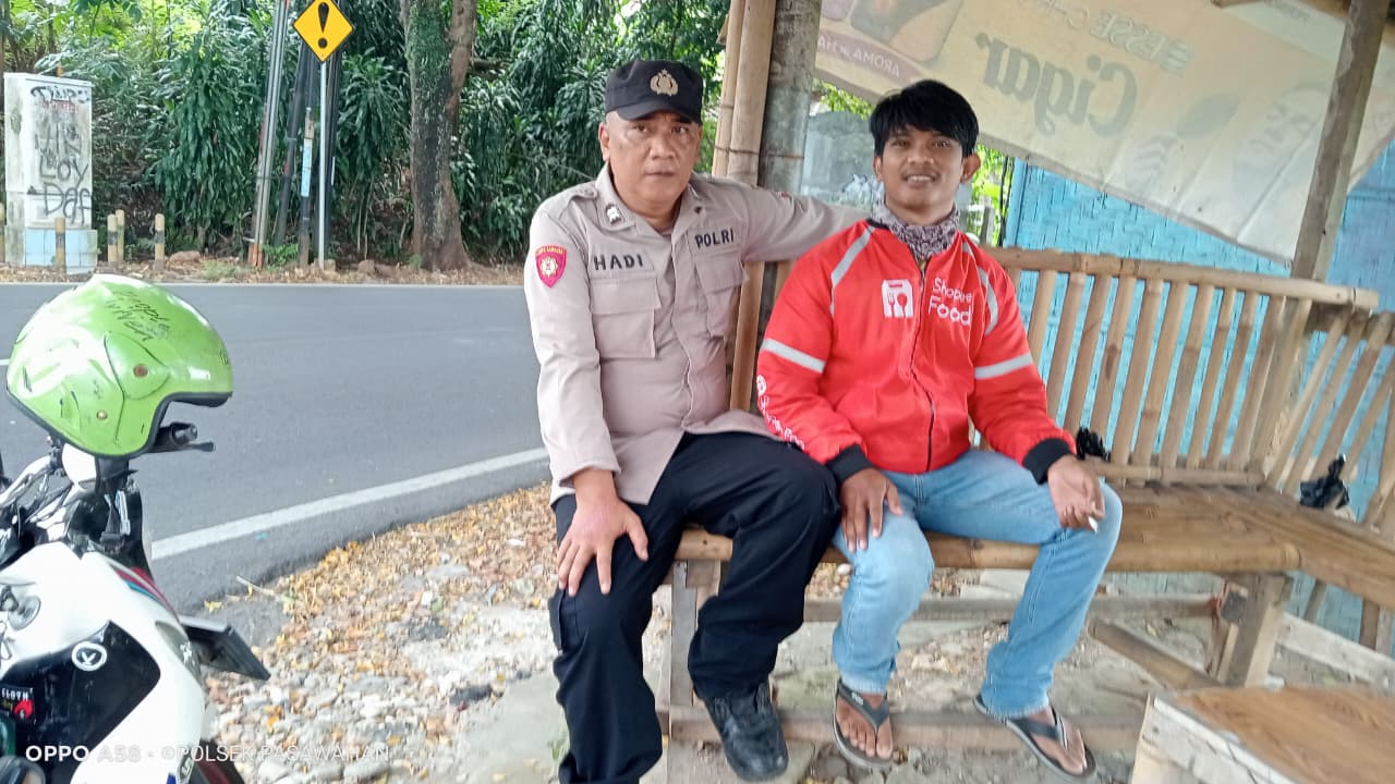 Jalin Silaturahmi, Bhabinkamtibmas Polsek Pasawahan Sambangi Ojol di Pertigaan Cihuni Jelang Libur Panjang Natal dan Tahun Baru