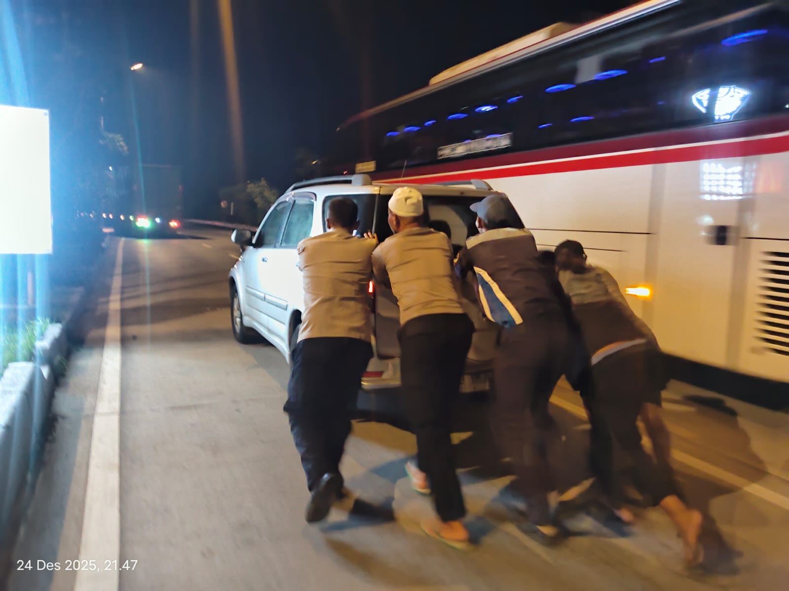 Mengetahui kondisi tersebut, dua personel Pos Pelayanan Nataru, Aipda Agus Ramdan dan Aipda Uci Sanusi, langsung bergerak cepat memberikan pertolongan. Bahkan, Aipda Uci terlihat tidak mengenakan sepatu karena baru saja selesai melaksanakan salat dan bergegas membantu pengendara agar kendaraan segera dipindahkan ke lokasi yang lebih aman.