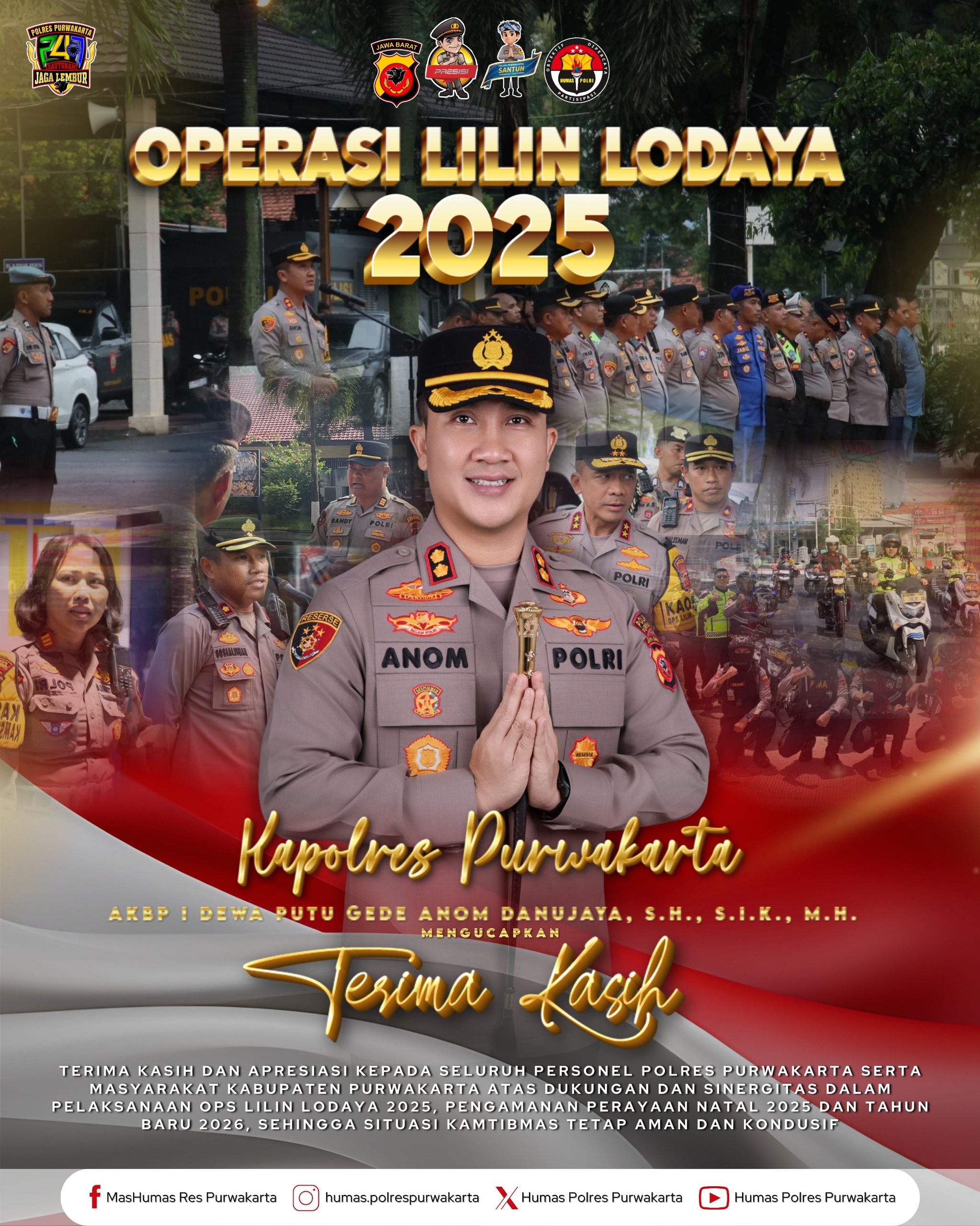 PURWAKARTA – Kapolres Purwakarta, AKBP I Dewa Putu Gede Anom Danujaya mengucapkan terima kasih dan apresiasi setinggi-tingginya kepada seluruh personel Polres Purwakarta serta seluruh elemen masyarakat Kabupaten Purwakarta atas dukungan, sinergi, dan kebersamaan dalam pelaksanaan Ops Lilin Lodaya 2025.