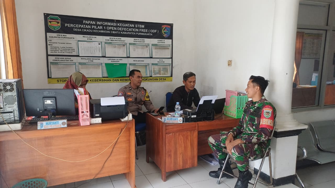 PURWAKARTA – Upaya memperkuat sinergitas dan soliditas TNI–Polri di tingkat desa, Bhabinkamtibmas Desa Cikadu Aipda Komarudin bersama Babinsa Desa Cikadu Serda Tantan melaksanakan kegiatan koordinasi dan komunikasi dengan perangkat desa di Kantor Desa Cikadu, Kecamatan Cibatu, Kabupaten Purwakarta, Kamis (15/01/2026).