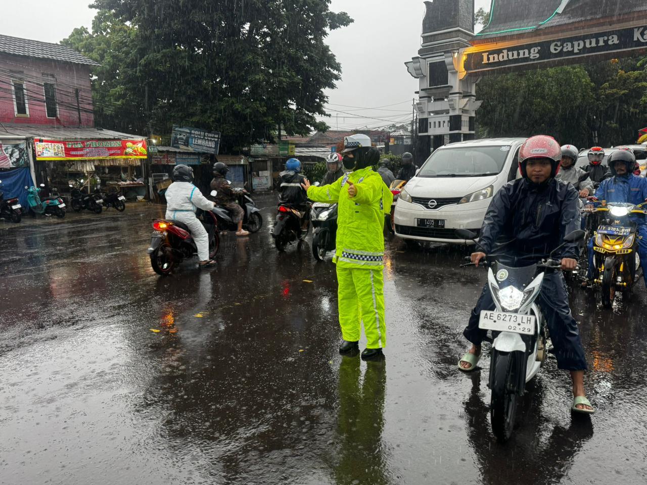 Kehadiran polisi lalu lintas di lapangan menjadi bentuk nyata komitmen Polri dalam memberikan rasa aman dan nyaman kepada masyarakat, meskipun dalam kondisi cuaca yang kurang bersahabat.